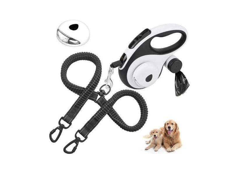 Coleira retrátil dupla para 2 cães grandes (até 50 kg cada) - Coleira extensível para animais de estimação de 4,9 m de cabeça dupla com sacos para cocô e luz de LED, quebra e trava de um botão, sem