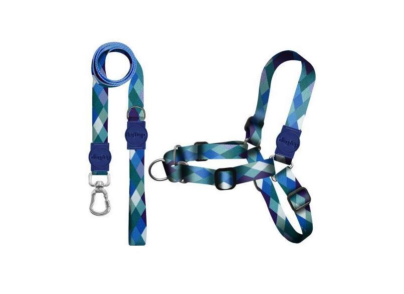 Kit Guia Premium + Peitoral Antipuxão Quadriculada Azul Dog Trip Brasi