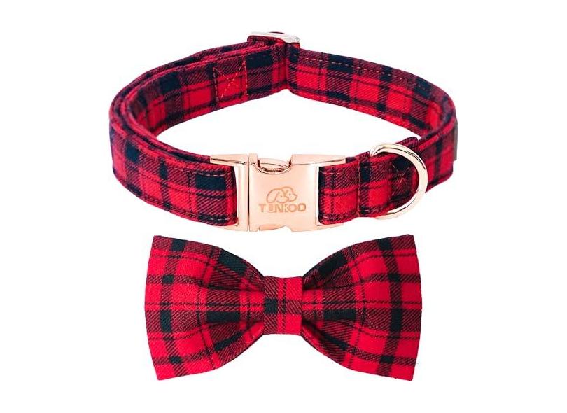 Tunkoo Coleira de Natal para cães com gravata borboleta - coleira xadrez de algodão vermelho super fofa, ajustável, disponível em pequeno, médio, grande para meninas, meninos, cães, G