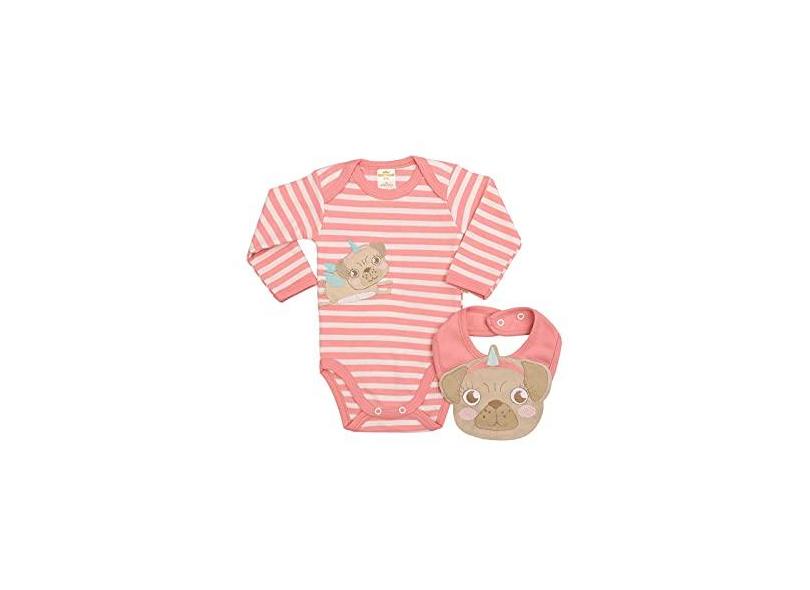 Conjunto body e babador Best Club Baby listrado rosa goiaba e creme com bordado cachorro