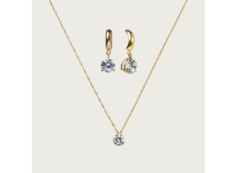 Conjunto Gargantilha E Brinco Em Ouro 18k Com Ponto De Luz Redondo Em Zircônia