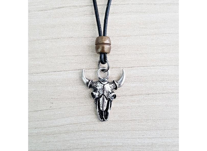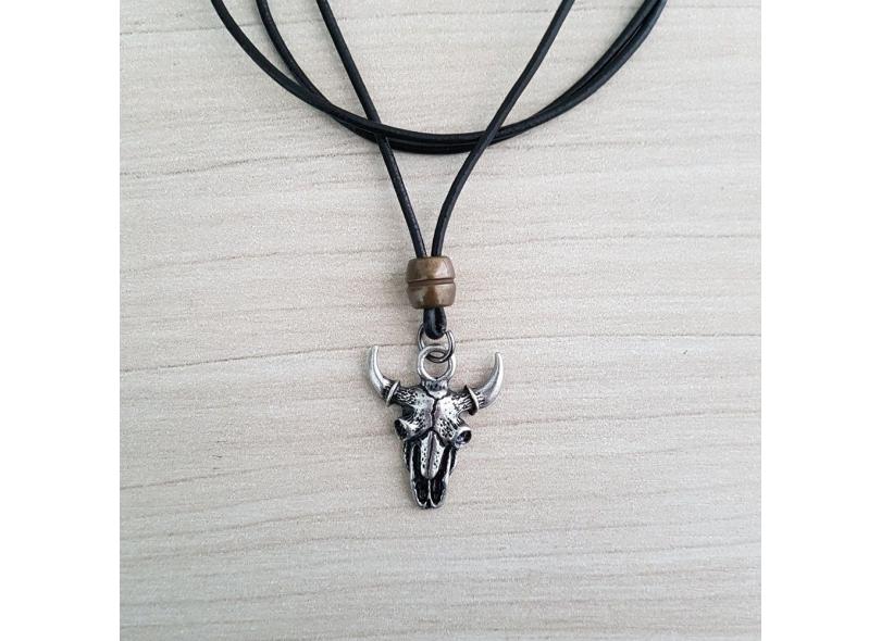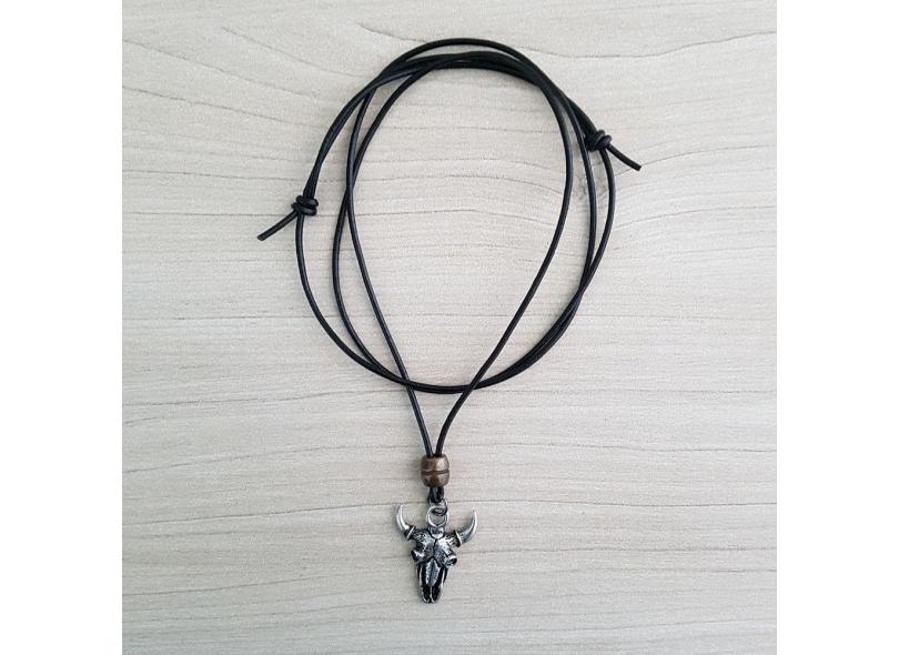 Colar Masculino Cordão Couro Pingente Cabeça De Boi