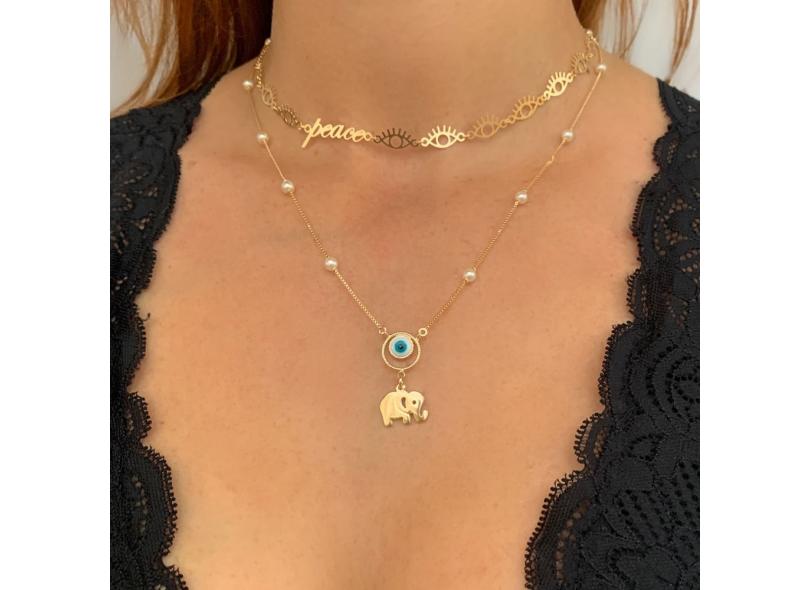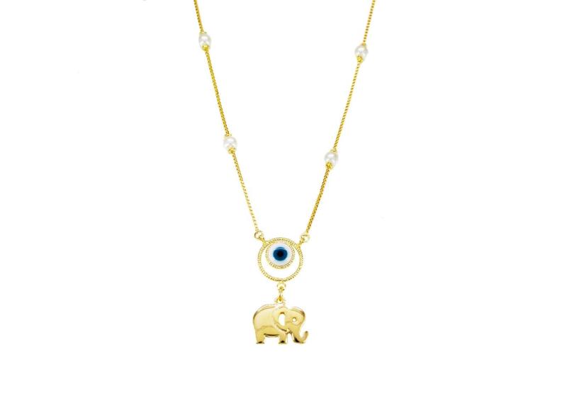 Colar Pérolas Olho Grego Elefante da Fortuna Banhado a Ouro 18k