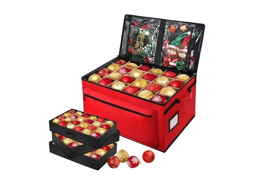 LHMTQVK Caixa de armazenamento de enfeites de Natal premium, comporta divisórias ajustáveis de ornamentos de até 182 a 10 cm, 3 bandejas individuais com separadores, 2 bolsos superiores, bolso
