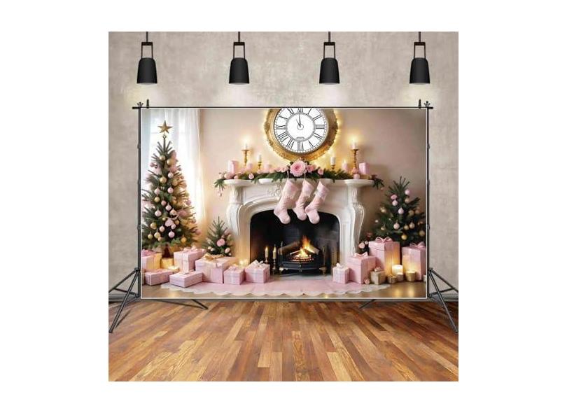 Pano de fundo rosa para lareira de Natal, enfeites de decoração para casa, acessórios de fotografia 210 x 150 cm