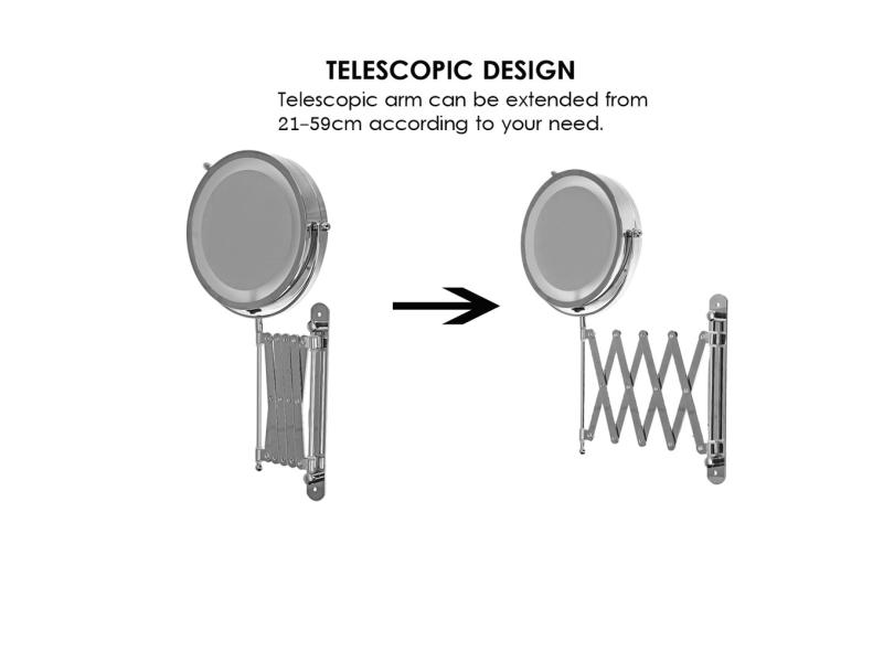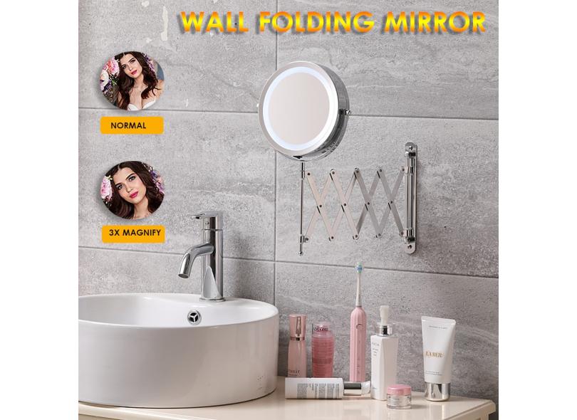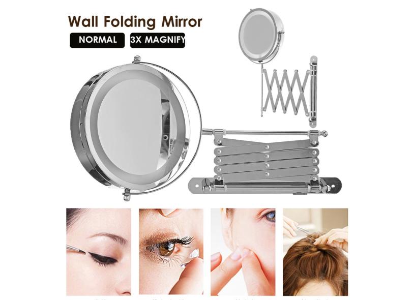 Espelho de maquiagem telescópico dobrável de 7 para banheiro com suporte de parede de ampliação LED 3x