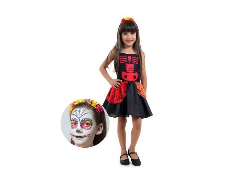 Fantasia Caveira Mexicana Com Maquiagem Infantil - Dia Das Bruxas - Ha