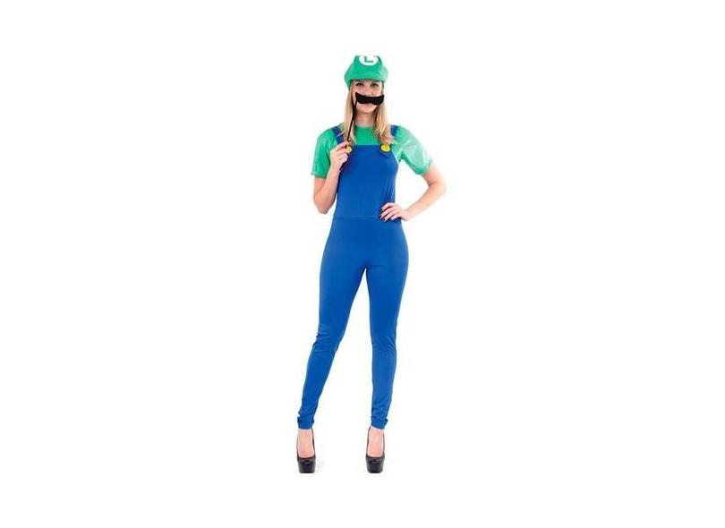 Fantasia Super Mário Adulto Luigi Feminina Com Bigode e Chapéu - Sulam