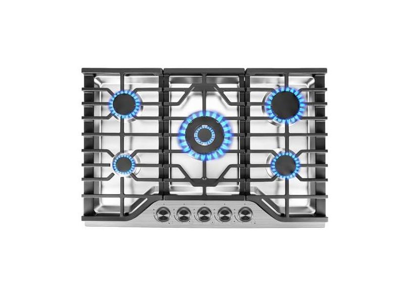 Fogão a gás de 76 cm com 5 queimadores Itália SABAF 39400BTU, aço inoxidável de 0,6 mm, grelha de ferro fundido resistente, combustível duplo GLG/NG, proteção contra vazamento
