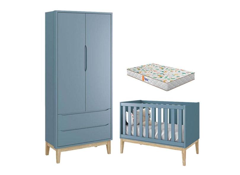 Berço Americano e Guarda Roupa 2 Portas New Classic Azul com Pés Madeira Natural e Colchão Gazin - Reller