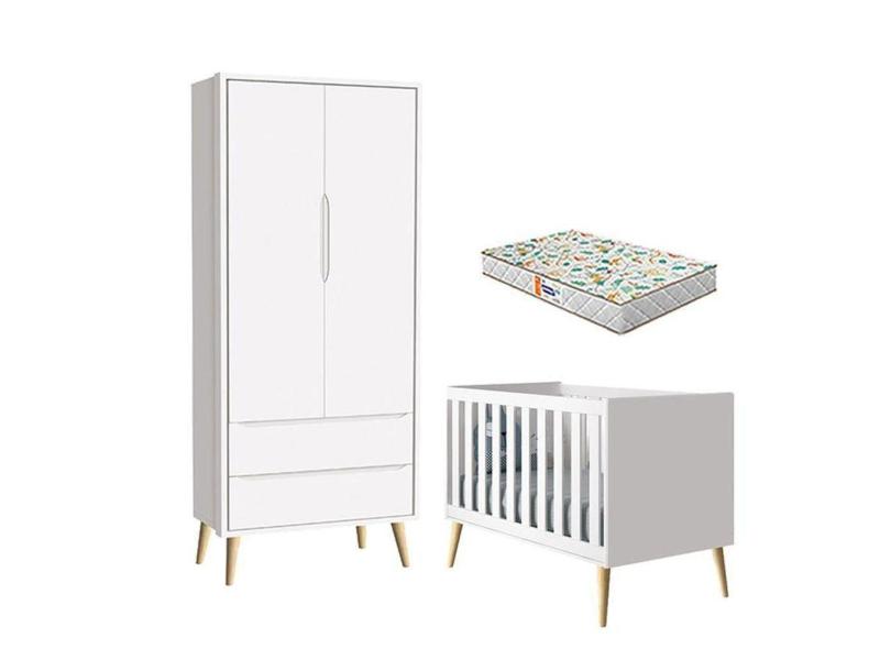 Berço Americano E Guarda Roupa 2 Portas Theo Branco Pés Madeira Natural Com Colchão Gazin - Reller