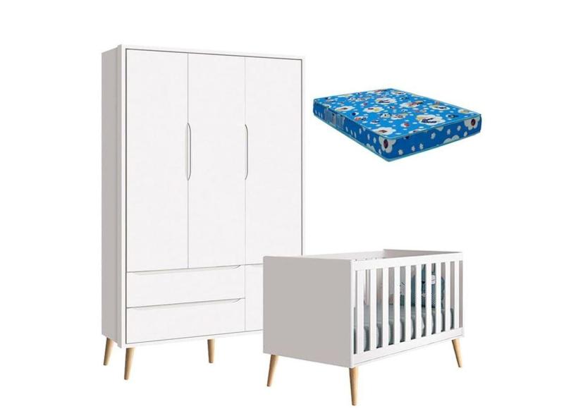 Berço Americano e Guarda Roupa 3 Portas Infantil Theo Branco Acetinado com Pés Madeira Natural e Colchão – Reller