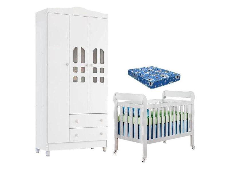 O menor preço encontrado no Brasil para Berço Americano E Guarda Roupa Infantil New Selena 3 Portas Branco Brilho Com Colchão Ortobom atualmente é R$ 1.039,10.