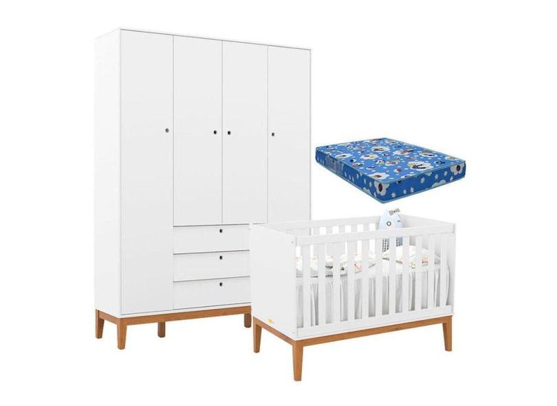 O menor preço encontrado no Brasil para Berço Americano e Guarda Roupa Unique 4 Portas Branco Soft Eco Wood com Colchão Ortobom - Matic atualmente é R$ 1.964,92.