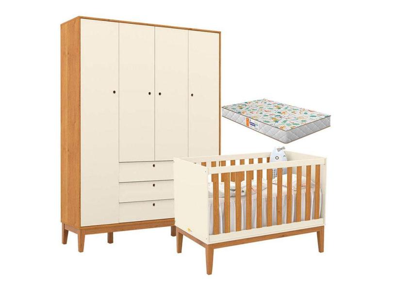 Berço Americano e Guarda Roupa Unique 4 Portas Off White Freijó Eco Wood com Colchão Gazin - Matic