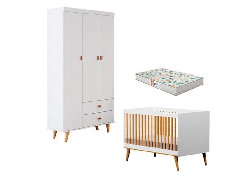 Berço Americano Ligia Com Guarda Roupa 3 Portas Duda Branco Acetinado Bétula E Colchão Gazin Móveis