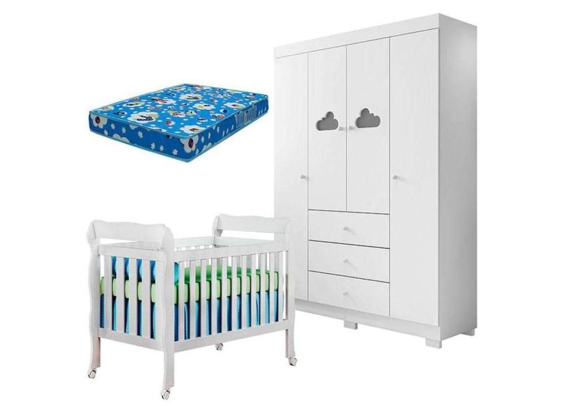 Berço Americano Lila E Guarda Roupa Ane Branco Brilho Com Colchão Ortobom - Phoenix Baby
