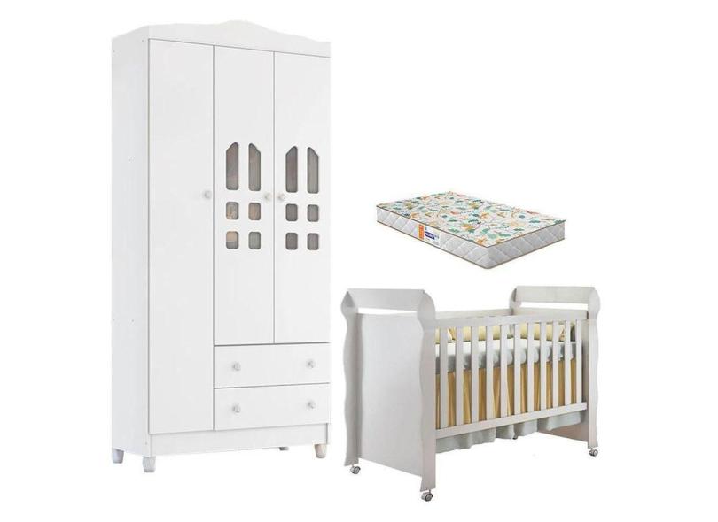 Berço Americano Mirelle E Guarda Roupa New Selena 3 Portas Branco Brilho Com Colchão Gazin Móveis