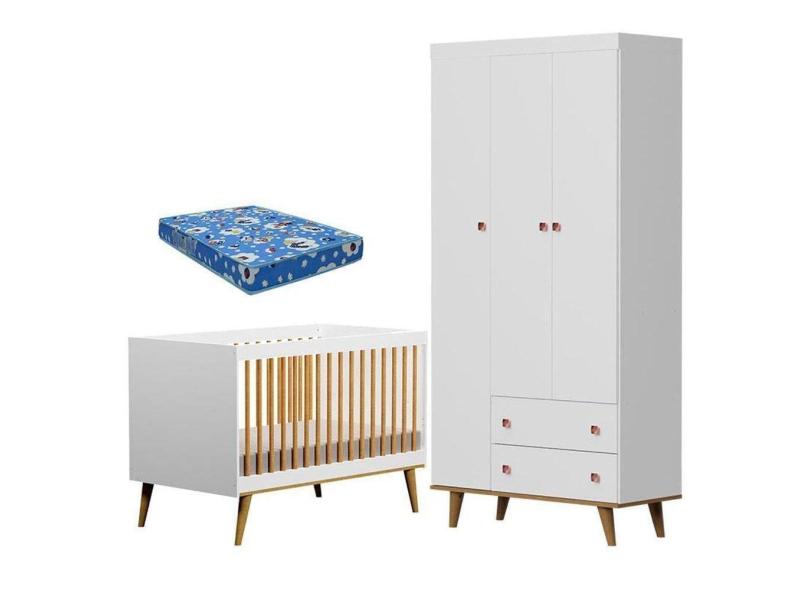 Berço Ligia E Guarda Roupa Fernanda 3 Portas Branco Bétula Com Colchão Ortobom - Carolina Baby