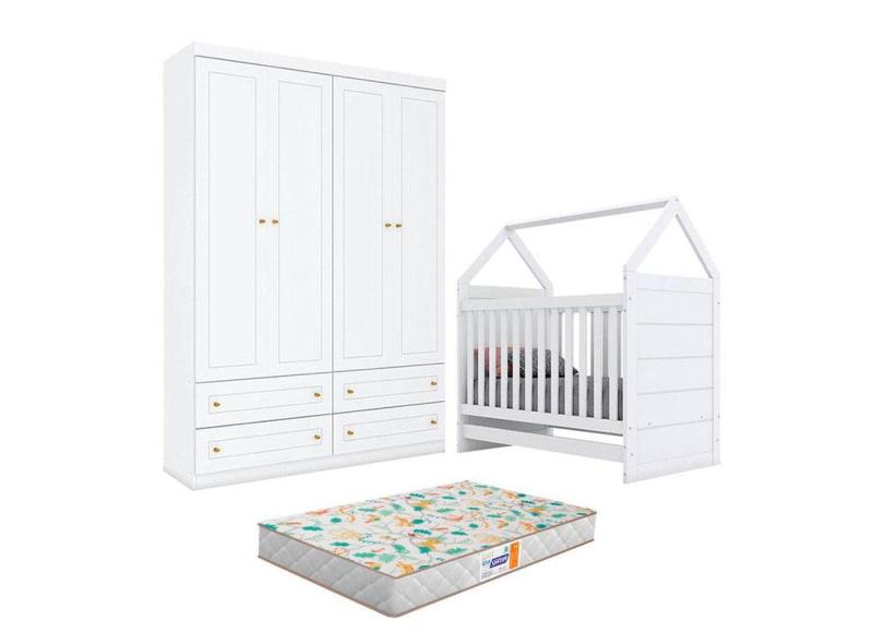 Berço Montessoriano Americano e Guarda Roupa Infantil Mississipi 4 Portas Branco com Colchão Gazin - Henn
