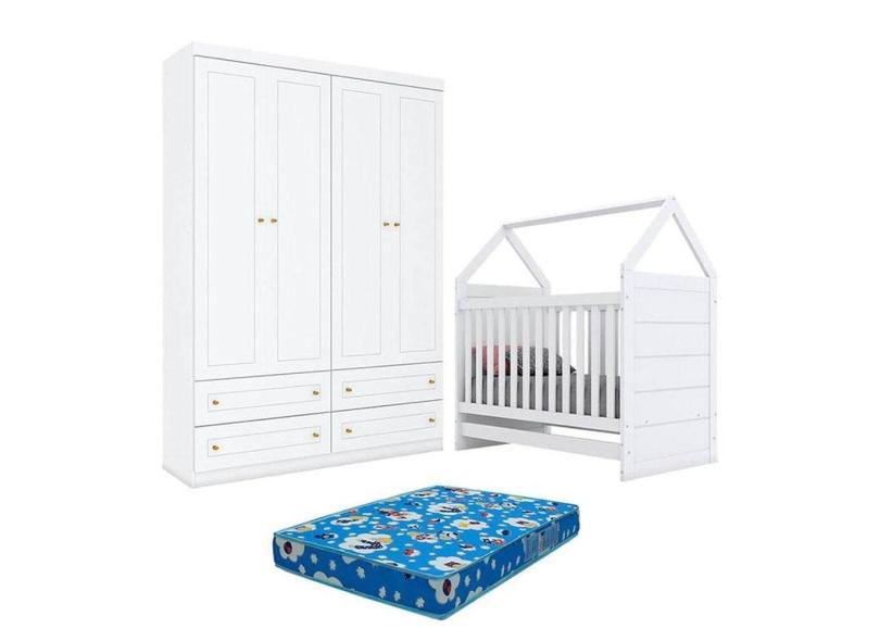Berço Montessoriano e Guarda Roupa Infantil Americano 4 Portas Branco com Colchão Ortobom - Henn