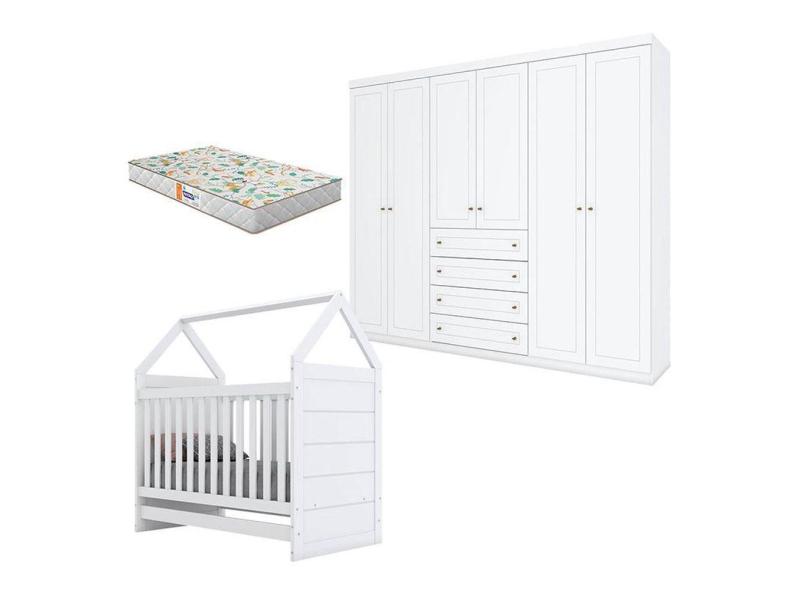 Berço Montessoriano E Guarda Roupa Infantil Mississipi 6 Portas Branco Hp Com Colchão Gazin - Henn