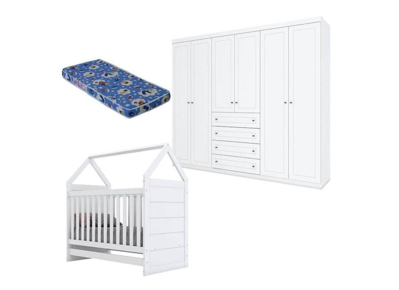 Berço Montessoriano e Guarda Roupa Infantil Mississipi 6 Portas Branco HP com Colchão Ortobom - Henn
