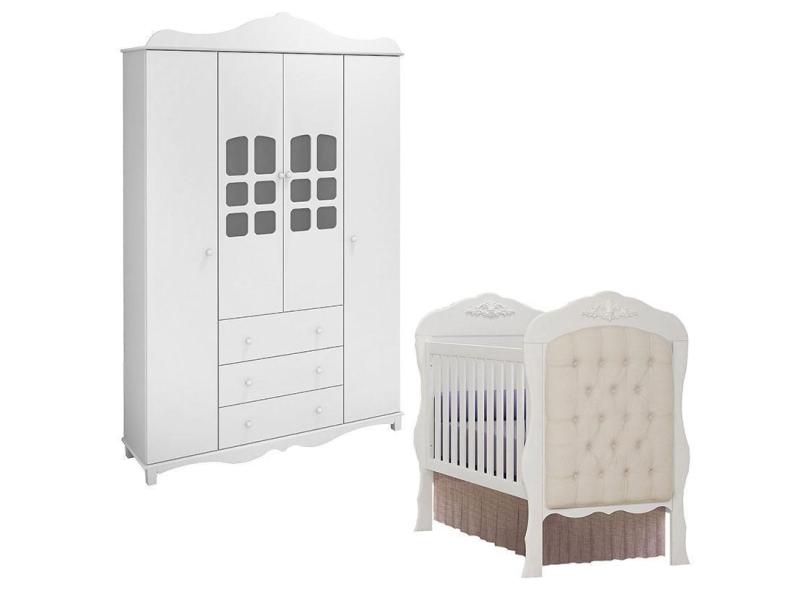 Berço Realeza com Capitonê Bege e Guarda Roupa Imperial 4 Portas Branco Acetinado - Canaã