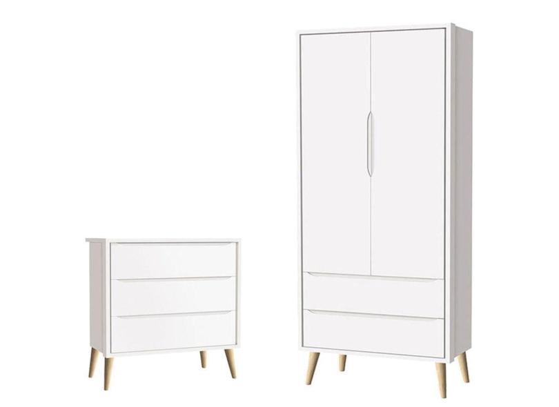 Cômoda Gaveteiro Infantil E Guarda Roupa 2 Portas Theo Branco Acetinado Pés Madeira Natural - Reller