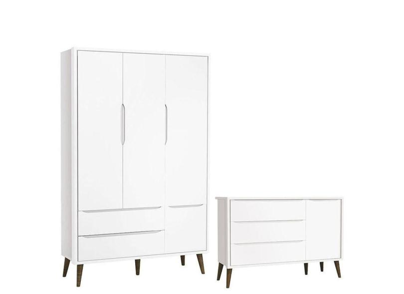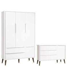 Cômoda Infantil Com Porta E Guarda Roupa 3 Portas Theo Branco Acetinado Com Pés Amadeirado - Reller