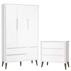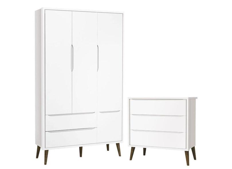 Cômoda Infantil Gaveteiro e Guarda Roupa 3 Portas Theo Branco Acetinado com Pés Amadeirado – Reller