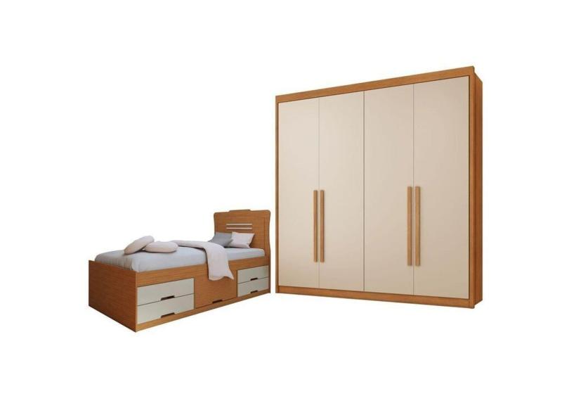 Conjunto Cama Solteiro 5 Gavetas Júlia e Guarda-Roupa Casal 4 Portas 4 Gavetas Bergame Cinamomo/Off White