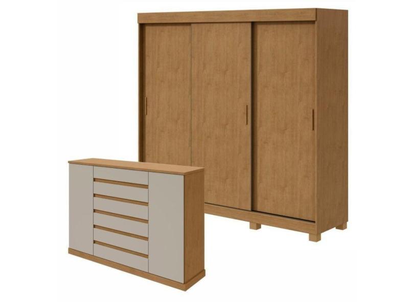 Conjunto de Guarda-Roupa 3 Portas 3 Gavetas Saion Plus com Pés e Cômoda Vedra  Amêndoa Clean/Off White