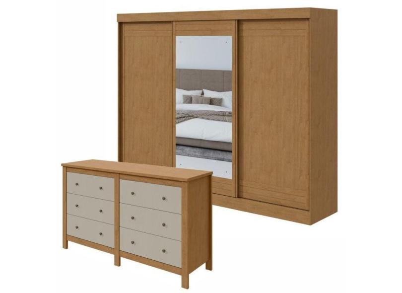 Conjunto de Guarda-Roupa 3 Portas 4 Gavetas Nice com Espelho e Cômoda Maggiore New Amêndoa Clean/Off White