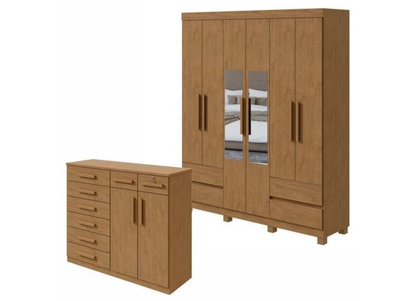 Conjunto de Guarda-Roupa 6 Portas 4 Gavetas Zeus com Espelho e com Pés e Cômoda Toronto Amêndoa Clean