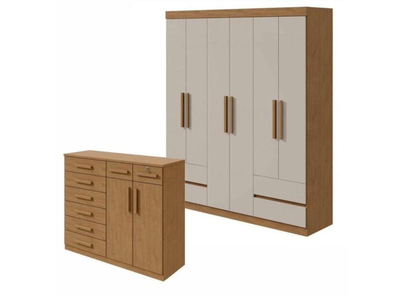 Conjunto de Guarda-Roupa 6 Portas 4 Gavetas Zeus e Cômoda 8 Gavetas 2 Portas Toronto Amêndoa Clean/Off White