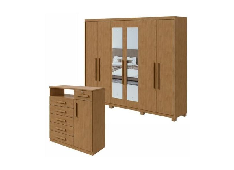 O menor preço encontrado no Brasil para Conjunto de Guarda-roupa 6 portas com espelho e pés Áries e Cômoda Da Vinci com Nicho Amêndoa Clean atualmente é R$ 2.082,63.