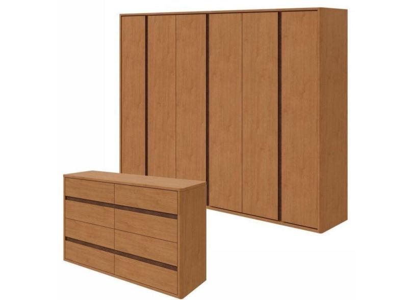 Conjunto de Guarda-Roupa Casal Leder 6 Portas e Cômoda 8 Gavetas 150x95cm Leder Amêndoa Clean