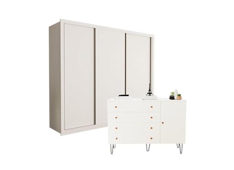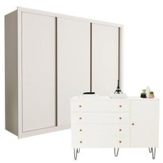 Conjunto Guarda-roupa Casal 3 Portas e Cômoda 1 Porta 4 Gavetas Branco