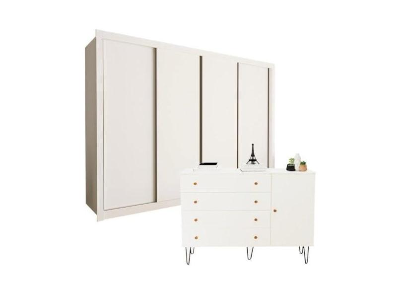 Conjunto Guarda-roupa Casal 4 Portas e Cômoda 1 Porta 4 Gavetas Branco
