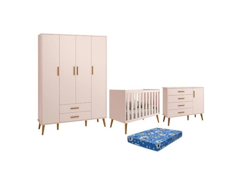 O menor preço encontrado no Brasil para Dormitório Infantil Isis Guarda Roupa 4 Portas, Cômoda 1 Porta e Berço com Colchão - Reller Móveis Rosa atualmente é R$ 2.487,10.