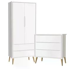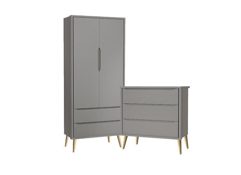 Guarda Roupa 2 Portas E Cômoda 3 Gav Theo Cinza Fosco Pés Madeira Natu