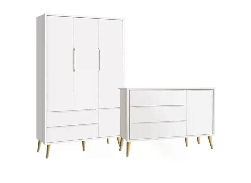 Guarda Roupa 3 Portas E Cômoda Com Porta Theo Branco Fosco Pés Madeira Natural - Reller Móveis Branco Fosco