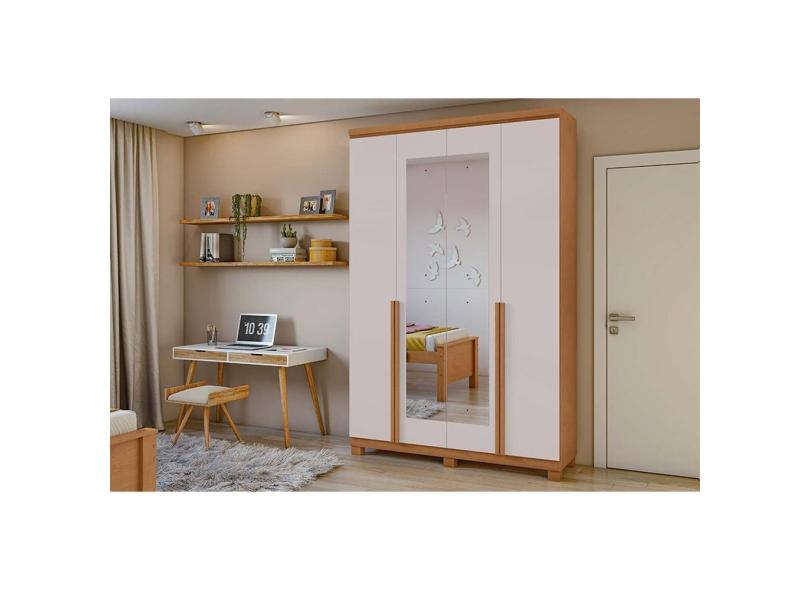 Guarda Roupa 4 Portas e 2 Gavetas c/ Espelho e Pés Alonzo Amendoa/Off White - Lopas