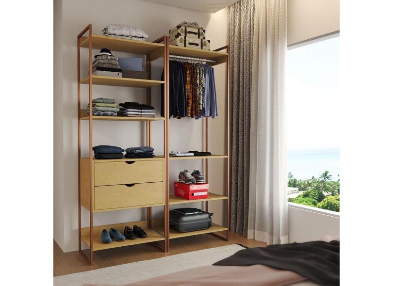 Guarda Roupa Aberto Industrial Casal 2 Módulos Canela Cabideiro com Gavetas Base Cobre