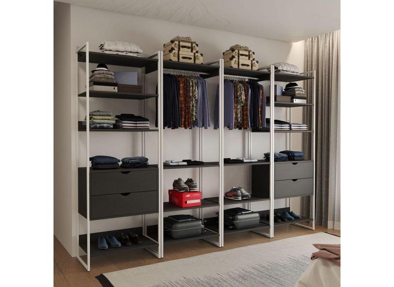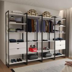 Guarda Roupa Aberto Industrial Casal Modulado Completo Preto Cabideiro com Gavetas Ferro Branco