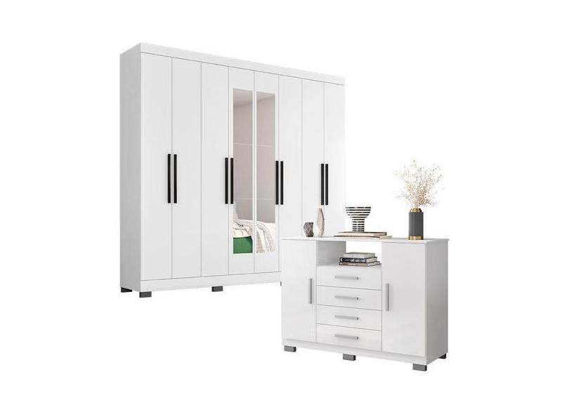 Guarda Roupa Casal 1684 Com Espelho E Cômoda 8020 Branco New Pés - Ara