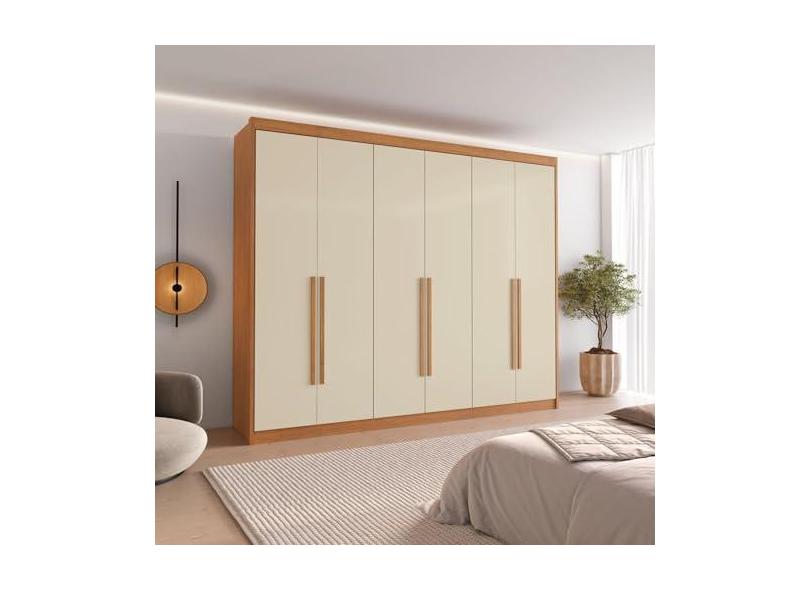 Guarda Roupa Casal 6 Portas com Puxador de Madeiras 8 Gavetas Cinamomo/Off White