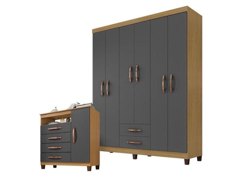 Guarda Roupa Casal Módena E Cômoda Sapateira Cannes Carvalho Americano Grafite - Incorplac.