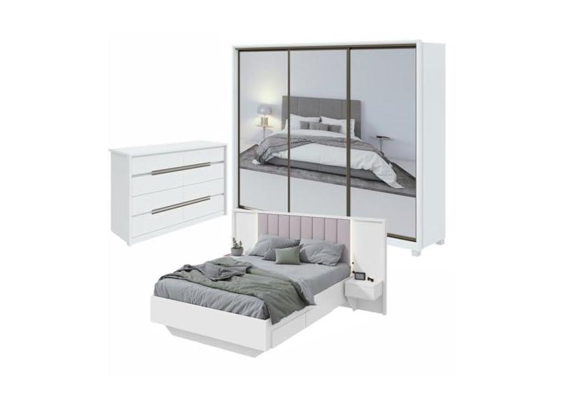 Guarda-roupa Casal Super Glass, Cômoda Urban e Cama Casal Solaris Branco